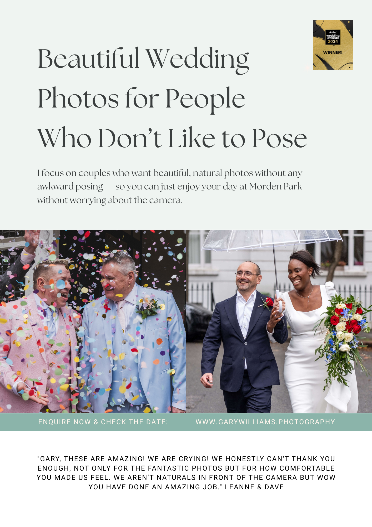 Beautiful Wedding Photos for People Who Don’t Like to Pose. I focus on couples who want beautiful, natural photos without any awkward posting - so you can just enjoy your day at Morden Park without worrying about the camera. www.garywilliams.photography .